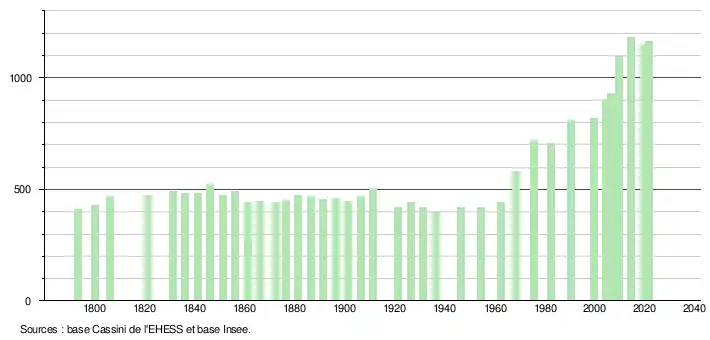 L'évolution du nombre d'habitants est connue à travers les recensements de la population effectués dans la commune depuis 1793. Pour les communes de moins de 10 000 habitants, une enquête de recensement portant sur toute la population est réalisée tous les cinq ans, les populations légales des années intermédiaires étant quant à elles estimées par interpolation ou extrapolation[26]. Pour la commune, le premier recensement exhaustif entrant dans le cadre du nouveau dispositif a été réalisé en 2004[27].