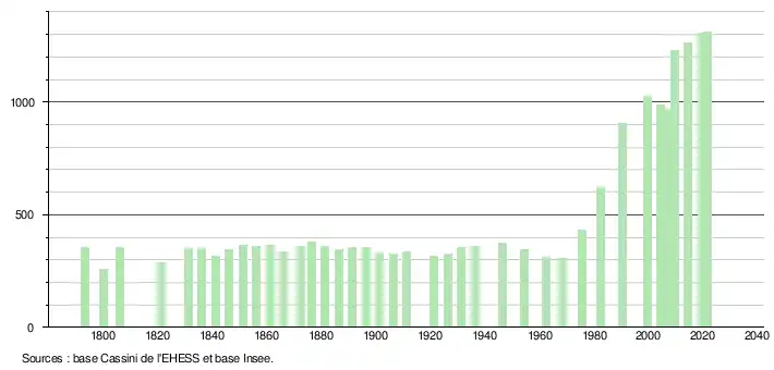 L'évolution du nombre d'habitants est connue à travers les recensements de la population effectués dans la commune depuis 1793. Pour les communes de moins de 10 000 habitants, une enquête de recensement portant sur toute la population est réalisée tous les cinq ans, les populations légales des années intermédiaires étant quant à elles estimées par interpolation ou extrapolation[18]. Pour la commune, le premier recensement exhaustif entrant dans le cadre du nouveau dispositif a été réalisé en 2004[19].