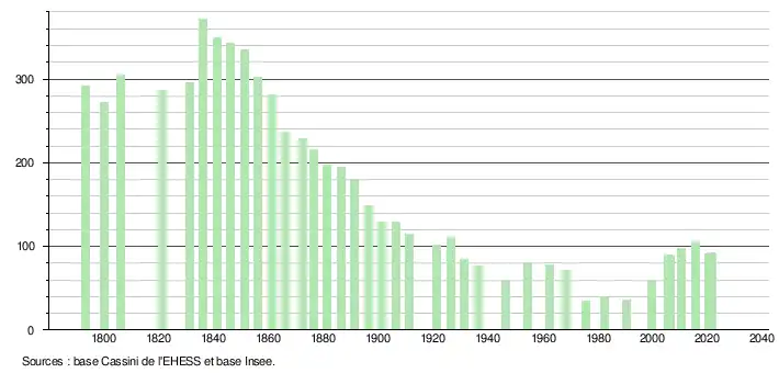 L'évolution du nombre d'habitants est connue à travers les recensements de la population effectués dans la commune depuis 1793. Pour les communes de moins de 10 000 habitants, une enquête de recensement portant sur toute la population est réalisée tous les cinq ans, les populations légales des années intermédiaires étant quant à elles estimées par interpolation ou extrapolation[16]. Pour la commune, le premier recensement exhaustif entrant dans le cadre du nouveau dispositif a été réalisé en 2005[17].