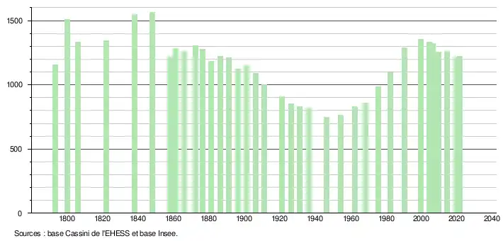 L'évolution du nombre d'habitants est connue à travers les recensements de la population effectués dans la commune depuis 1793. Pour les communes de moins de 10 000 habitants, une enquête de recensement portant sur toute la population est réalisée tous les cinq ans, les populations légales des années intermédiaires étant quant à elles estimées par interpolation ou extrapolation[20]. Pour la commune, le premier recensement exhaustif entrant dans le cadre du nouveau dispositif a été réalisé en 2004[21].