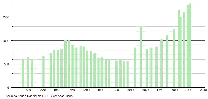 L'évolution du nombre d'habitants est connue à travers les recensements de la population effectués dans la commune depuis 1793. Pour les communes de moins de 10 000 habitants, une enquête de recensement portant sur toute la population est réalisée tous les cinq ans, les populations légales des années intermédiaires étant quant à elles estimées par interpolation ou extrapolation[24]. Pour la commune, le premier recensement exhaustif entrant dans le cadre du nouveau dispositif a été réalisé en 2008[25].