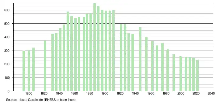 L'évolution du nombre d'habitants est connue à travers les recensements de la population effectués dans la commune depuis 1793. Pour les communes de moins de 10 000 habitants, une enquête de recensement portant sur toute la population est réalisée tous les cinq ans, les populations légales des années intermédiaires étant quant à elles estimées par interpolation ou extrapolation[23]. Pour la commune, le premier recensement exhaustif entrant dans le cadre du nouveau dispositif a été réalisé en 2006[24].