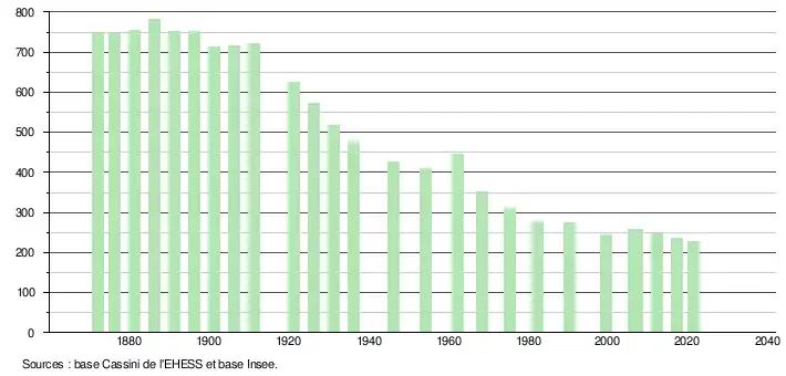 L'évolution du nombre d'habitants est connue à travers les recensements de la population effectués dans la commune depuis 1872. Pour les communes de moins de 10 000 habitants, une enquête de recensement portant sur toute la population est réalisée tous les cinq ans, les populations légales des années intermédiaires étant quant à elles estimées par interpolation ou extrapolation[19]. Pour la commune, le premier recensement exhaustif entrant dans le cadre du nouveau dispositif a été réalisé en 2007[20].