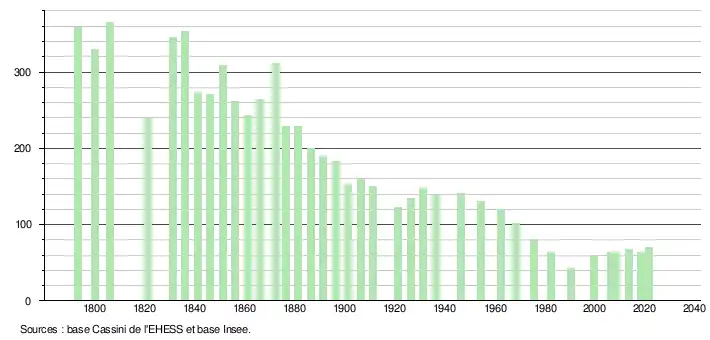 L'évolution du nombre d'habitants est connue à travers les recensements de la population effectués dans la commune depuis 1793. Pour les communes de moins de 10 000 habitants, une enquête de recensement portant sur toute la population est réalisée tous les cinq ans, les populations légales des années intermédiaires étant quant à elles estimées par interpolation ou extrapolation[28]. Pour la commune, le premier recensement exhaustif entrant dans le cadre du nouveau dispositif a été réalisé en 2008[29].