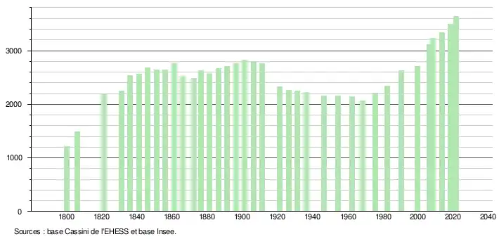 L'évolution du nombre d'habitants est connue à travers les recensements de la population effectués dans la commune depuis 1800. Pour les communes de moins de 10 000 habitants, une enquête de recensement portant sur toute la population est réalisée tous les cinq ans, les populations légales des années intermédiaires étant quant à elles estimées par interpolation ou extrapolation[25]. Pour la commune, le premier recensement exhaustif entrant dans le cadre du nouveau dispositif a été réalisé en 2008[26].