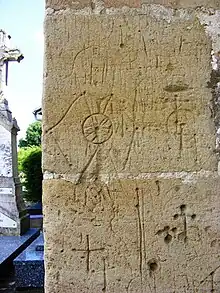 - À la partie supérieure du second pilier, à gauche, dans la nef centrale, se trouve l'épitaphe funéraire du prêtre Demenge Mengeot. Une autre est scellée dans le contrefort qui avoisine le portail nord, dont voici le libellé : « D.O.M. Cy gist François Poupart, défunt mari à Anne Guérin qui d’une volonté unanime ont fondé, dans cette église, trois jours de l’octave des Morts. Il est décédé dans sa 39e année, 1760, le ». Suit une tête de mort, sur deux tibias croisés, avec ces mots : « Telle que je suis ainsi vous serez. Regardez-moy si vous voulez ».