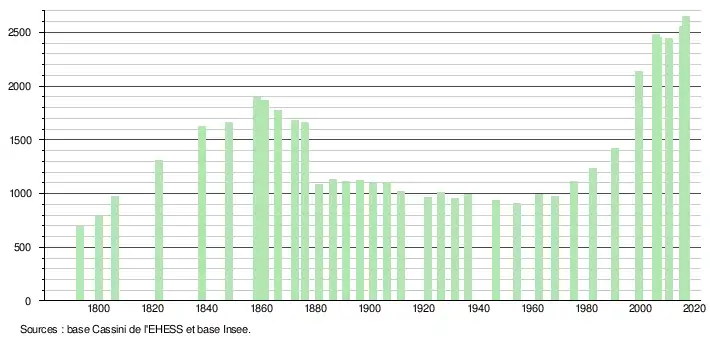 L'évolution du nombre d'habitants est connue à travers les recensements de la population effectués dans la commune depuis 1793. Pour les communes de moins de 10 000 habitants, une enquête de recensement portant sur toute la population est réalisée tous les cinq ans, les populations légales des années intermédiaires étant quant à elles estimées par interpolation ou extrapolation[12]. Pour la commune, le premier recensement exhaustif entrant dans le cadre du nouveau dispositif a été réalisé en 2005[13].