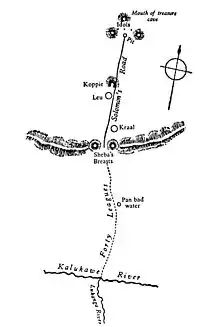 Dans le deuxième chapitre, une fois le contrat passé entre Quatermain et les deux autres, celui-ci leur raconta que lorsqu'il chassait le koudou près de la ville sud-africaine de Lydenburg, il vit des mineurs découvrir une cavité souterraine abritant une cité en ruine, qui selon un certain Evans, ne serait autre que la légendaire Ophir. C'est ce lieu biblique qui aurait envoyé régulièrement au roi Salomon des riches cargaisons de pierres et métaux précieux, de bois (probablement de santal), d'ivoire, d'animaux exotiques... Ce même Evans, chasseur d'éléphant enterré près des chutes du Zambèze, a aussi parlé au chasseur des montagnes de Suliman, en pays Mashoukouloumbwé[3], derrière lesquelles se situeraient ces fameuses mines (Suliman étant la forme arabe de Salomon), au pays des Koukouanas. Il rajoute que lorsqu'il était en pays Manica (en)[4], il a connu une isanousi (sorcière pratiquant la médecine) qui lui expliqua qu'au-delà de ces montagnes vivent des descendants des Zoulous, dont le dialecte diffère et qui vivent isolés sur un territoire doté d'une mine de « pierres brillantes ».