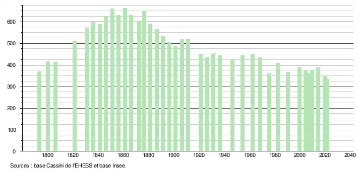 L'évolution du nombre d'habitants est connue à travers les recensements de la population effectués dans la commune depuis 1793. Pour les communes de moins de 10 000 habitants, une enquête de recensement portant sur toute la population est réalisée tous les cinq ans, les populations légales des années intermédiaires étant quant à elles estimées par interpolation ou extrapolation[17]. Pour la commune, le premier recensement exhaustif entrant dans le cadre du nouveau dispositif a été réalisé en 2004[18].