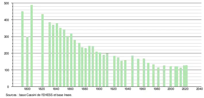 L'évolution du nombre d'habitants est connue à travers les recensements de la population effectués dans la commune depuis 1793. Pour les communes de moins de 10 000 habitants, une enquête de recensement portant sur toute la population est réalisée tous les cinq ans, les populations légales des années intermédiaires étant quant à elles estimées par interpolation ou extrapolation[26]. Pour la commune, le premier recensement exhaustif entrant dans le cadre du nouveau dispositif a été réalisé en 2008[27].