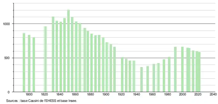 L'évolution du nombre d'habitants est connue à travers les recensements de la population effectués dans la commune depuis 1793. Pour les communes de moins de 10 000 habitants, une enquête de recensement portant sur toute la population est réalisée tous les cinq ans, les populations légales des années intermédiaires étant quant à elles estimées par interpolation ou extrapolation[30]. Pour la commune, le premier recensement exhaustif entrant dans le cadre du nouveau dispositif a été réalisé en 2008[31].