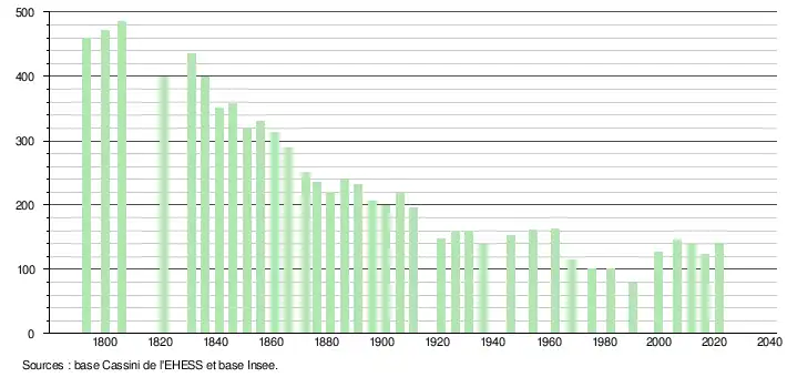 L'évolution du nombre d'habitants est connue à travers les recensements de la population effectués dans la commune depuis 1793. Pour les communes de moins de 10 000 habitants, une enquête de recensement portant sur toute la population est réalisée tous les cinq ans, les populations légales des années intermédiaires étant quant à elles estimées par interpolation ou extrapolation[24]. Pour la commune, le premier recensement exhaustif entrant dans le cadre du nouveau dispositif a été réalisé en 2006[25].