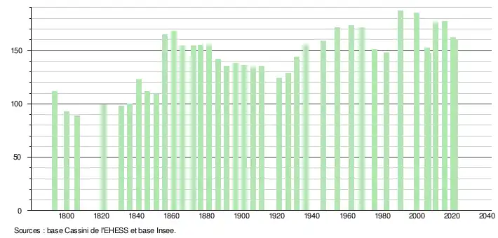 L'évolution du nombre d'habitants est connue à travers les recensements de la population effectués dans la commune depuis 1793. Pour les communes de moins de 10 000 habitants, une enquête de recensement portant sur toute la population est réalisée tous les cinq ans, les populations légales des années intermédiaires étant quant à elles estimées par interpolation ou extrapolation[20]. Pour la commune, le premier recensement exhaustif entrant dans le cadre du nouveau dispositif a été réalisé en 2005[21].
