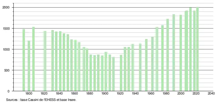 | L'évolution du nombre d'habitants est connue à travers les recensements de la population effectués dans la commune depuis 1793. Pour les communes de moins de 10 000 habitants, une enquête de recensement portant sur toute la population est réalisée tous les cinq ans, les populations légales des années intermédiaires étant quant à elles estimées par interpolation ou extrapolation[29]. Pour la commune, le premier recensement exhaustif entrant dans le cadre du nouveau dispositif a été réalisé en 2007[30]. En 2021, la commune comptait 2 007 habitants[Note 4], en diminution de 1,13 % par rapport à 2015 (Isère : +2,71 %, France hors Mayotte : +1,84 %). |