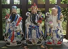 C'est à partir de la Dynastie Ming (明朝), c'est-à-dire entre le XIVe et le XVIIe siècle (1368-1644 après J.-C.) que vint l'idée de représenter les divinités de la Bonne Fortune ou du Bonheur sous forme humaine. Pour cela, on choisit parmi le panthéon déjà existant, trois Esprits/Dieux qui représenteraient le mieux cette fonction ; ce furent celui des « Émoluments ou Salaires », celui de « la Richesse » et celui de la « Longévité ». Tous trois devaient devenir inséparables à l'avenir pour apporter tout le bonheur au peuple.