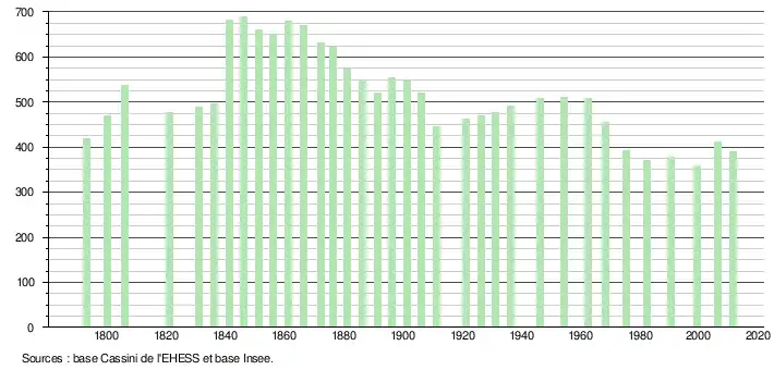 L'évolution du nombre d'habitants est connue à travers les recensements de la population effectués dans la commune depuis 1793. À partir du , les populations légales des communes sont publiées annuellement dans le cadre d'un recensement qui repose désormais sur une collecte d'information annuelle, concernant successivement tous les territoires communaux au cours d'une période de cinq ans. Pour les communes de moins de 10 000 habitants, une enquête de recensement portant sur toute la population est réalisée tous les cinq ans, les populations légales des années intermédiaires étant quant à elles estimées par interpolation ou extrapolation[21]. Pour la commune, le premier recensement exhaustif entrant dans le cadre du nouveau dispositif a été réalisé en 2006[22],[Note 2].