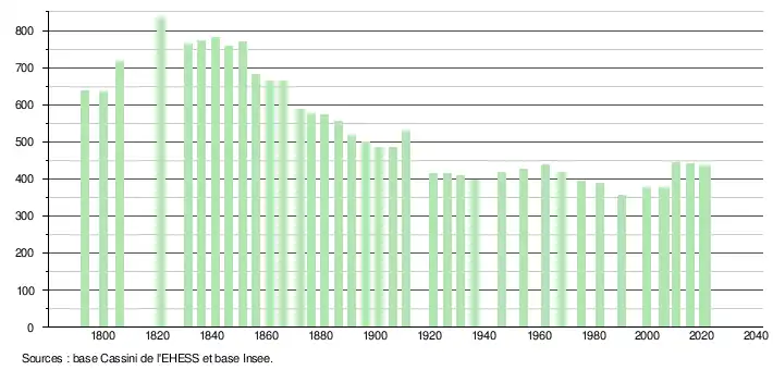 L'évolution du nombre d'habitants est connue à travers les recensements de la population effectués dans la commune depuis 1793. Pour les communes de moins de 10 000 habitants, une enquête de recensement portant sur toute la population est réalisée tous les cinq ans, les populations légales des années intermédiaires étant quant à elles estimées par interpolation ou extrapolation[37]. Pour la commune, le premier recensement exhaustif entrant dans le cadre du nouveau dispositif a été réalisé en 2005[38].
