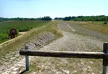 Le déversoir de Jargeau, dans le Loiret, est long de plus de 700 mètres, dont 575 mètres de seuil, et présente une dénivelée de 2 mètres par rapport à la crête de la levée[37]. Il est muni d'une banquette fusible, de 1,50 m au-dessus du seuil, dont le but est d'optimiser le fonctionnement de l'ouvrage pour la crue de dimensionnement, qui était la crue de 1825 (7 m au-dessus de l'étiage)[38].