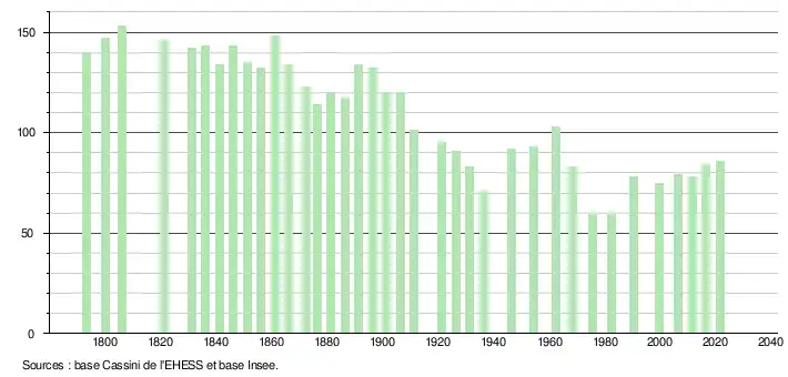 L'évolution du nombre d'habitants est connue à travers les recensements de la population effectués dans la commune depuis 1793. Pour les communes de moins de 10 000 habitants, une enquête de recensement portant sur toute la population est réalisée tous les cinq ans, les populations légales des années intermédiaires étant quant à elles estimées par interpolation ou extrapolation[22]. Pour la commune, le premier recensement exhaustif entrant dans le cadre du nouveau dispositif a été réalisé en 2006[23].