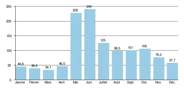 En ce qui concerne la période estivale, la plus importante car libre de glaces (de juin à septembre inclus), le débit mensuel minimum observé a été de 42,3 m3/s en , ce qui restait encore abondant.