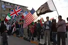Le , en accord avec la résolution 1973 du Conseil de sécurité des Nations unies, une intervention militaire aéronavale est déclenchée par la France avec l'opération Harmattan, suivie par le Royaume-Uni et les États-Unis, appuyées par l'Italie, afin d'établir une zone d'exclusion aérienne et de protéger les populations civiles contre les bombardements[64]. Plusieurs navires de guerre ainsi que des avions de chasse sont mobilisés pour détruire les défenses anti-aériennes des forces loyales au colonel Kadhafi afin d'empêcher que les insurgés et les forces de la coalition ne subissent des attaques[65]. Les attaques de la coalition ont débuté alors que les forces de l'armée libyenne investissaient les faubourgs de Benghazi et s'apprêtaient à investir le centre-ville. L'invasion de Benghazi est empêchée.