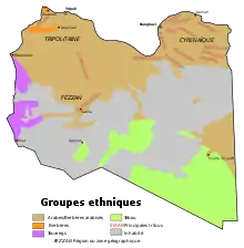 La Libye (en arabe : ليبيا, Libya ; en berbère : ⵍⵉⴱⵢⴰ, Libya), en forme longue l'État de Libye[5] (en arabe : دولة ليبيا, Dawlat Libya ; en berbère : ⴰⵡⴰⵏⴽ ⵏ ⵍⵉⴱⵢⴰ, Awanek n Libya), est un État d'Afrique du Nord faisant partie du Maghreb. Elle est bordée au nord par la mer de Libye en mer Méditerranée, au nord-ouest par la Tunisie, à l'ouest par l'Algérie, au sud-ouest par le Niger, au sud-sud-est par le Tchad, au sud-est par le Soudan et à l'est par l'Égypte. Elle s'étend sur 1 759 540 km2, ce qui la place au quatrième rang africain et au dix-huitième rang mondial. Sa population est estimée entre 6 et 8 millions d'habitants. Elle se concentre sur les côtes, l'intérieur du pays étant désertique. Sa capitale, Tripoli, est également sa plus grande agglomération (1,8 million d'habitants), devant Benghazi (650 000 habitants), Misrata (plus de 350 000 habitants[6]) et El Beïda (250 000 habitants[7]).