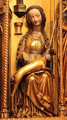 Liée à la virginité des jeunes filles, la « capture de la licorne » semble issue de la culture de l’amour courtois[2]. Des centaines, voire des milliers de miniatures présentent la même mise en scène inspirée du Physiologos : la bête est séduite par une vierge traitresse, un chasseur survient pour lui transpercer le flanc avec une lance[3].