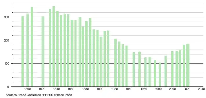 | L'évolution du nombre d'habitants est connue à travers les recensements de la population effectués dans la commune depuis 1793. Pour les communes de moins de 10 000 habitants, une enquête de recensement portant sur toute la population est réalisée tous les cinq ans, les populations légales des années intermédiaires étant quant à elles estimées par interpolation ou extrapolation[43]. Pour la commune, le premier recensement exhaustif entrant dans le cadre du nouveau dispositif a été réalisé en 2005[44]. En 2021, la commune comptait 184 habitants[Note 7], en augmentation de 1,66 % par rapport à 2015 (Ariège : +1,38 %, France hors Mayotte : +1,84 %). |