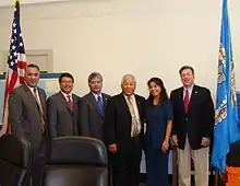 Photo représentant certains des lieutenant-gouverneur des Îles Mariannes du Nord. De gauche à droite : Nikolao Pula, directeur des affaires insulaires; Diego T. Benavente, représentant de la CNMI, président de la Commission des relations extérieures et des États-Unis; Arnold I. Palacios, président de la CNMI; Pete P. Reyes, président du Sénat; Glenna P. Reyes, directrice adjointe, Bureau législatif; Doug Domenech, secrétaire adjoint intérimaire aux affaires insulaires [Photo : Randy Beffrey, BAI
