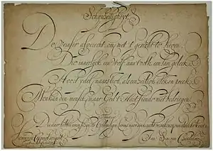 - Epreuve de calligraphie, 1662, 1 f. La Haye KB : 135 G 7. Sur un poème de Henrick Bruno (1617-1664).