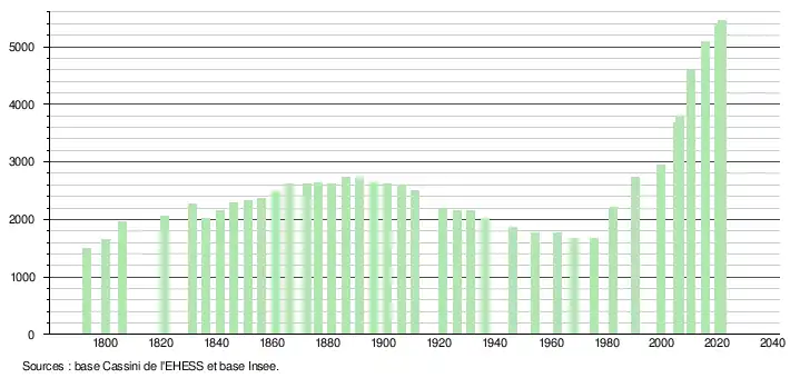 L'évolution du nombre d'habitants est connue à travers les recensements de la population effectués dans la commune depuis 1793. Pour les communes de moins de 10 000 habitants, une enquête de recensement portant sur toute la population est réalisée tous les cinq ans, les populations légales des années intermédiaires étant quant à elles estimées par interpolation ou extrapolation[26]. Pour la commune, le premier recensement exhaustif entrant dans le cadre du nouveau dispositif a été réalisé en 2005[27].