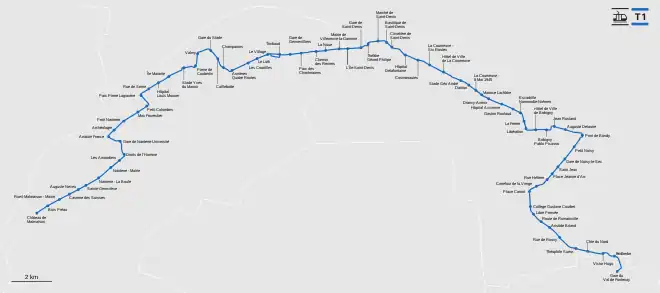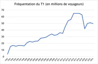 La ligne T1 dessert depuis cette date vingt-six stations et transporte en moyenne 100 000 voyageurs chaque jour ouvrable en 2003[a 6], fréquentation qui atteint en semaine 115 000 voyageurs par jour en 2008[8].