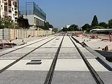 Dans les zones moins sensibles aux vibrations, on insère plus simplement sur le lit de béton des plaques, préfabriquées en usine, entre les deux files de rails d'une des voies, afin d'achever la plate-forme et son aspect pavé traditionnel. Cette pose est très différente de celle initiale de la ligne, où des pavés de granit avaient été posés de manière traditionnelle lors de l'achèvement de la plate-forme, mais n'avaient pas résisté à l'orniérage de la voie[13].