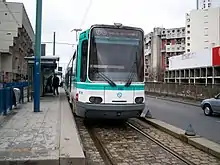 La rame TFS no 116 sur le quai central allongé de la station Hôtel de Ville de La Courneuve, en .