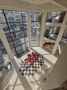 - Pierre Sorin met en place des panneaux d'affichage vidéo projetant un film mettant en scène des personnages, qui par effet d'optique, semblent défiler sur les rails.