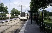 - La station François Mitterrand, qui constitue le terminus le plus à l'ouest de la ligne, est composée de deux quais encadrant deux voies. Dans le prolongement de la station, se situe un tiroir de retournement à voie unique le long du parc relais « François Mitterrand » permettant le retournement des rames. Deux trams sur 3 desservent cette station[13].
