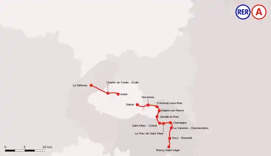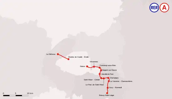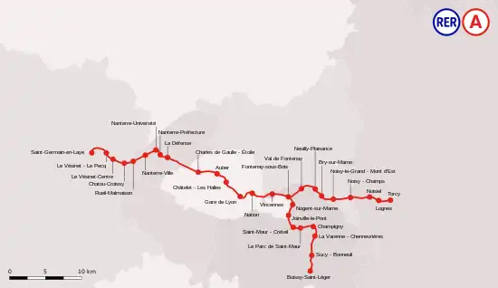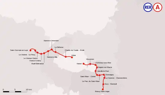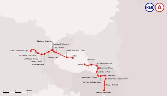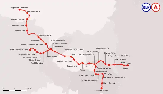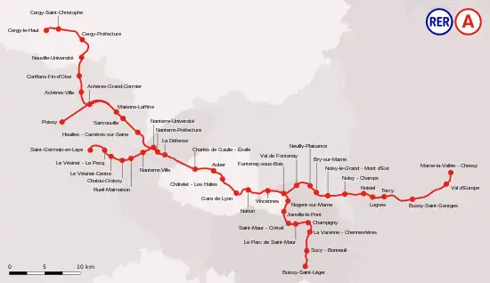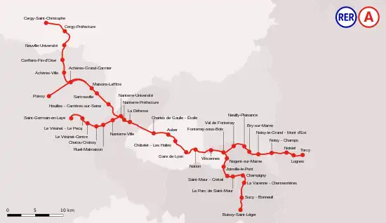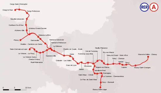 La ligne A du RER d'Île-de-France, plus souvent simplement nommée RER A, est une ligne du réseau express régional d'Île-de-France qui traverse d'est en ouest l'agglomération parisienne, avec plusieurs branches aux extrémités d'un tronçon central. Elle relie Saint-Germain-en-Laye, Cergy et Poissy à l'ouest, à Boissy-Saint-Léger et Marne-la-Vallée à l'est, en passant par le cœur de Paris.