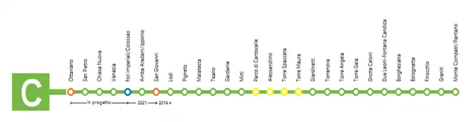 La ligne C comprendra, à terme, 30 stations[48], de Clodio-Mazzini au Nord à Pantano au Sud-Est dans la commune de Monte Compatri. Plusieurs d'entre elles doivent offrir des correspondances avec la ligne