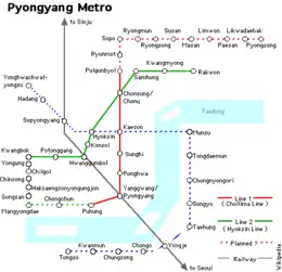 | Rimwon (en construction) | 림원역 | 林源驛 | - | Pyongyang-jikhalsi | Ryongsong |