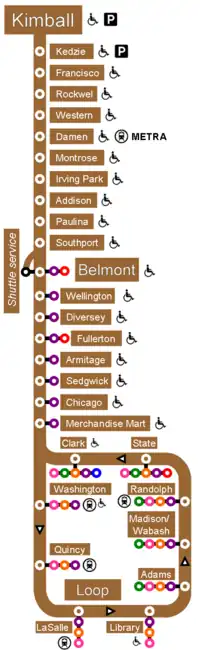À partir de la station Belmont, La ligne brune roule vers le sud et partage ses voies avec la ligne rouge jusqu'à la station Fullerton. La ligne mauve utilise les mêmes rails que la ligne brune mais uniquement en semaine pendant les heures de pointe. La ligne brune utilise les voies extérieures et s'arrête aux stations Wellington et Diversey tandis que la ligne rouge roule de manière express sur les voies centrales et ne dessert pas ces stations.