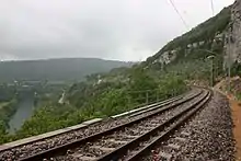- elle est sinueuse, le rayon des courbes atteignant parfois 300 mètres[8] (le rayon minimal des courbes est de 292 mètres dans le tunnel de Bolozon 2 et de 209 mètres en gare de Bellegarde).