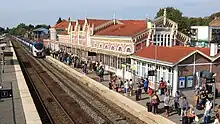 ![]() La gare SNCF (au fond à gauche), ainsi que la halte des Chemins de fer départementaux de la Somme (à droite), vues des voies en . |