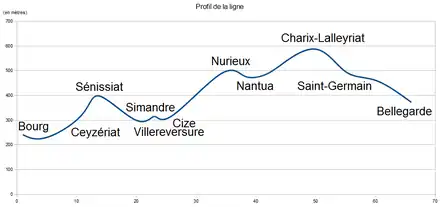 • elle possède une forte dénivellation, son altitude variant d'environ 240 mètres à Bourg-en-Bresse à 587 mètres au niveau de Charix-Lalleyriat[25]. La déclivité maximale est de 35  au niveau de la trémie remplaçant le PN 5[8] ;