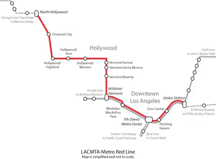 La ligne a connu une dernière phase d'extension en , afin de compléter la desserte du quartier de Hollywood et de relier North Hollywood, dans la vallée de San Fernando[4]. En , la branche vers l'ouest, tronçon de l'actuelle ligne D (alors ligne violette), est détachée de la ligne rouge et devient une ligne à part entière, partageant le tronçon entre Union Station en Wilshire/Vermont avec la ligne B (alors ligne rouge).