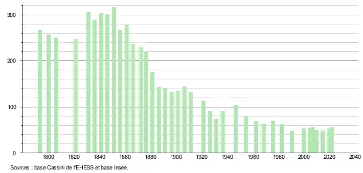 L'évolution du nombre d'habitants est connue à travers les recensements de la population effectués dans la commune depuis 1793. Pour les communes de moins de 10 000 habitants, une enquête de recensement portant sur toute la population est réalisée tous les cinq ans, les populations légales des années intermédiaires étant quant à elles estimées par interpolation ou extrapolation[17]. Pour la commune, le premier recensement exhaustif entrant dans le cadre du nouveau dispositif a été réalisé en 2004[18].
