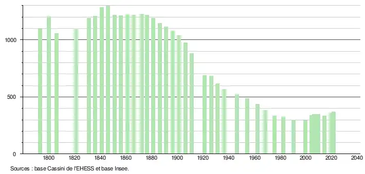 L'évolution du nombre d'habitants est connue à travers les recensements de la population effectués dans la commune depuis 1793. Pour les communes de moins de 10 000 habitants, une enquête de recensement portant sur toute la population est réalisée tous les cinq ans, les populations légales des années intermédiaires étant quant à elles estimées par interpolation ou extrapolation[15]. Pour la commune, le premier recensement exhaustif entrant dans le cadre du nouveau dispositif a été réalisé en 2004[16].