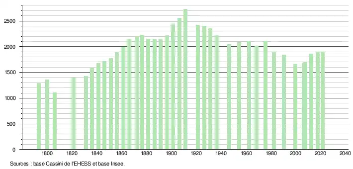 L'évolution du nombre d'habitants est connue à travers les recensements de la population effectués dans la commune depuis 1793. Pour les communes de moins de 10 000 habitants, une enquête de recensement portant sur toute la population est réalisée tous les cinq ans, les populations légales des années intermédiaires étant quant à elles estimées par interpolation ou extrapolation[32]. Pour la commune, le premier recensement exhaustif entrant dans le cadre du nouveau dispositif a été réalisé en 2007[33].