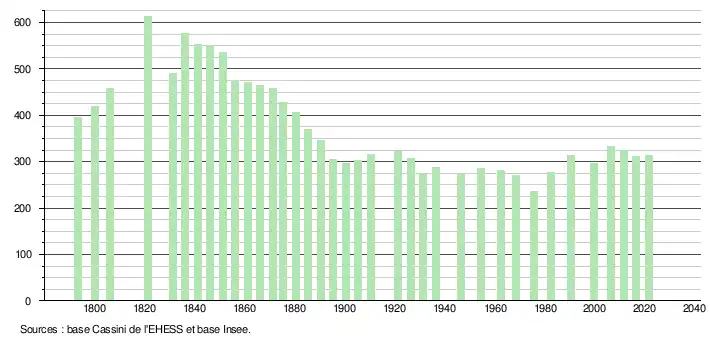 L'évolution du nombre d'habitants est connue à travers les recensements de la population effectués dans la commune depuis 1793. Pour les communes de moins de 10 000 habitants, une enquête de recensement portant sur toute la population est réalisée tous les cinq ans, les populations légales des années intermédiaires étant quant à elles estimées par interpolation ou extrapolation[16]. Pour la commune, le premier recensement exhaustif entrant dans le cadre du nouveau dispositif a été réalisé en 2006[17].