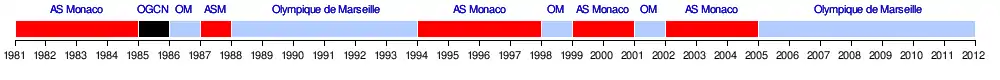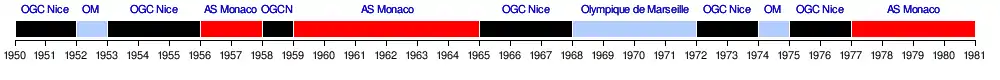 Seulement trois d'entre eux ont cependant réussi à décrocher des titres nationaux, l'Olympique de Marseille qui remporte pas moins de neuf titres de champion de France, dix coupes de France, trois coupes de la Ligue, trois trophées des champions,une Ligue des champions et une coupe Charles Drago, l'AS Monaco qui remporte huit titres de champion de France, cinq coupes de France, une coupe de la Ligue, deux trophées des champions et une coupe Charles Drago, et l'OGC Nice qui remporte quatre titres de champion de France, trois coupes de France et une coupe Charles Drago.