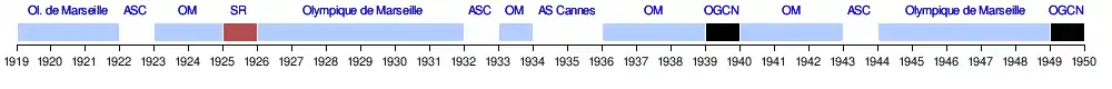 Les huit autres clubs passés par la première division sont l'AS Cannes (22 saisons), le SC Toulon (12), le FC Antibes (7), le FC Martigues (3), le FC Istres (1), l'Olympique Avignonnais (1), l'AS aixoise (1) et l'AC Arles-Avignon (1).